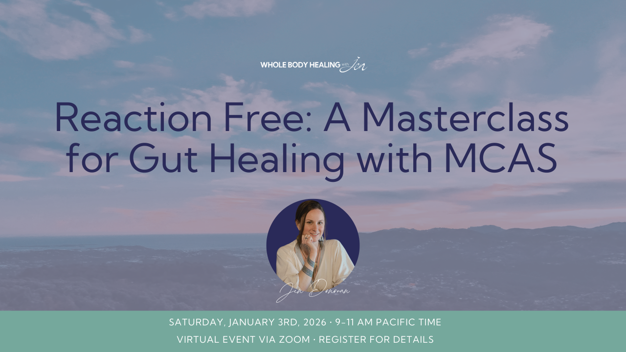 "Reaction Free" is a 2-hour live masterclass that will teach you the real root causes of Mast Cell Activation Syndrome (MCAS) and Histamine Intolerance— starting with the gut microbiome and mucosal layer. Whether you’re dealing with food sensitivities, environmental triggers, or constant, unexplained inflammation, this class will help you understand why it’s happening and how to begin calming your body’s reactivity— simple, straight forward, and with highly sensitive bodies in mind.